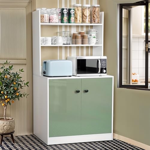 ABOUT SPACE 5 Tier Kitchen Organizer Rack – 5.5 ft Wooden Kitchen Cabinet with 3 Open Shelves & 2 Storage Rack with Door Easy to Assemble for Home Living Room (White, Green – L 80 x B 40.5 x H 163 cm) is available on Amazon.