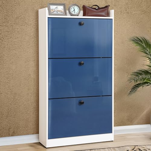 - SHOE STAND: With 3 Flip Drawers, this blue-white shoe cabinet with open breathable space at the back prevents odor and can store up to 18 – 20 pairs of shoes in the entryway, hallway, or living room, making your home look neat and space-saving. This slim shoe rack has an open storage platform equipped with a fence for keeping small items like keys, belts, picture frames, wallets and other small items for your convenience.