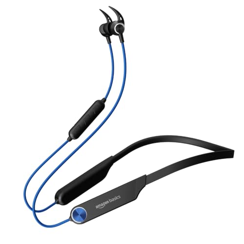 amazon basics in-Ear Wireless Neckband with Mic | Upto 100 Hours Playback | ENC Noise Cancellation | Quick Charge | Low Latency Gaming Mode | Built-in Mic & Voice Assistant | BT v5.4 | Blue is available on Amazon.