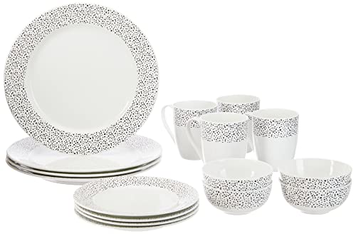Amazon Brand – Solimo Ceramic 16 Piece Polka Dot Dinner Set | 4 Dinner Plates, 4 Quarter Plates, 4 Mugs & 4 Small Bowls | Black Dotted Design is available on Amazon.