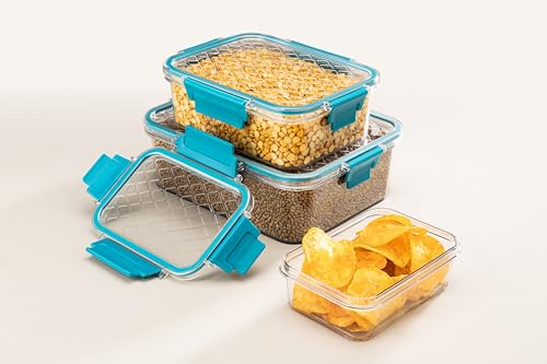 - SMART LOCK AIRTIGHT LID: Each container comes with a precision-designed smart lock airtight lid that helps preserve the freshness of stored items. The secure seal prevents moisture, air, and pests from entering, keeping food hygienic and safe for longer periods. Perfect for daily use in the fridge or kitchen cabinet without leakage or spillage concerns.