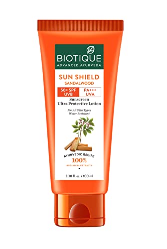 Biotique Bio Sandalwood Sunscreen Ultra Soothing Face Lotion, SPF 50+ |Ultra Protective Lotion| Keeps Skin Soft, Fair and Moisturized| Water Resistant| For All Skin Types| 100ml is available on Amazon.