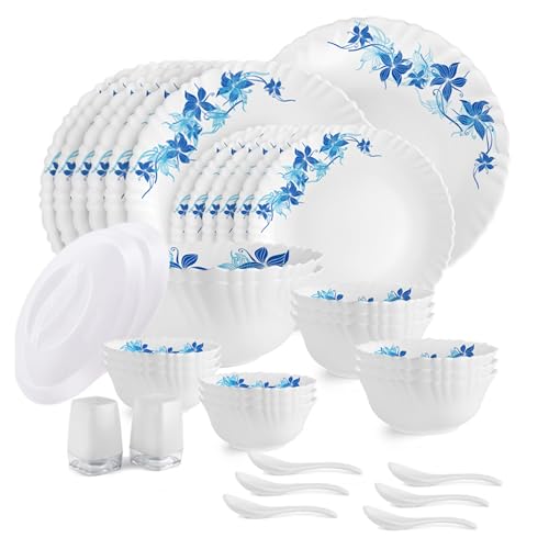 Cello Opalware Dazzle Series Blue Swirl Dinner Set, 37 Units | Opal Glass Dinner Set for 6 | Light-Weight, Daily Use Crockery Set for Dining | White Plate and Bowl Set is available on Amazon.