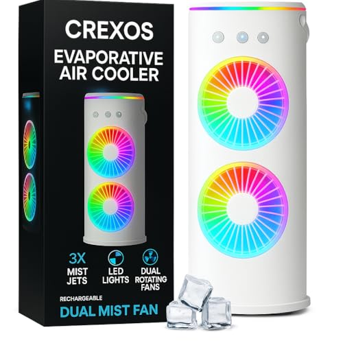 CREXOS 4000mAh Double Ended Spray Cold Air Fan, 2025 New 3 Gears USB Rechargeable LED Light Cooler Touch & Remote Ice Filling Fan Multifunctional Eco-Friendly (WHITE) is available on Amazon.