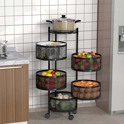 Kitchenstory Storage Rack | 360° Revolving Vegetable Kitchen Rack | Round Multipurpose Storage Trolley with Wheels | Metal Fruit Storage Rack | Kitchen Cabinet Spice Rack (Black, 5 Layer) is available on Amazon.