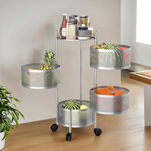 Kitchenstory Storage Rack | 360° Revolving Vegetable Kitchen Rack | Round Multipurpose Storage Trolley With Wheels | Metal Fruit Storage Rack | Kitchen Cabinet Spice Rack (Silver, 4 Layer) is available on Amazon.
