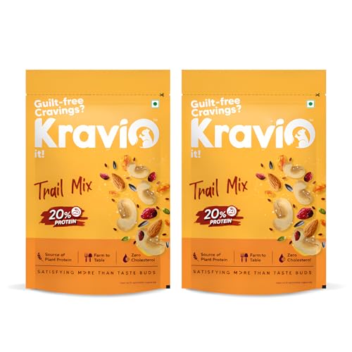 Kravio Premium Trail Mix (2 X 200g) | Mixed Dry Fruits & Nuts Contains Cashew, Almond, Cranberry, Raisin, Pumpkin, Sunflower & Flax Seeds | Healthy Snacks, 20% Protein, Rich in Fibre, Zero Cholesterol is available on Amazon.