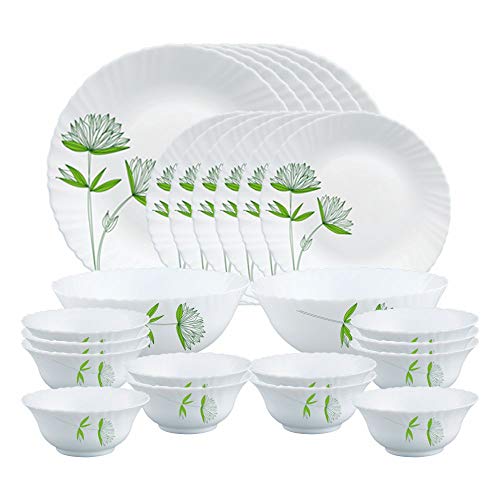 Larah by Borosil Green Lily Opalware Dinner Set, 28 Pcs, White is available on Amazon.