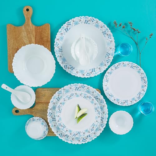 Larah by Borosil Silk Series Stardust Opalware Dinner Set | 35 Pieces for Family of 6 | Microwave & Dishwasher Safe | Bone-Ash Free | Crockery Set for Dining & Gifting | Plates & Bowls | White is available on Amazon.