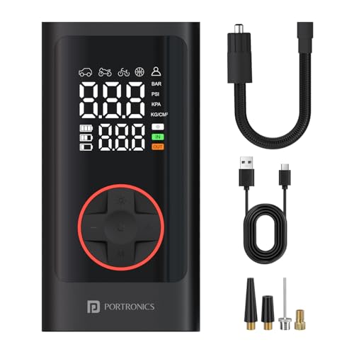 Portronics Vayu 7.0 Tyre Inflator, Full-Size Digital Display, 4000 mAh Battery, 150 PSI Pressure, Preset Modes, Flashlight with SOS, Pressure Detection, for Cars, Bikes, Bicycles & Balls(Black)