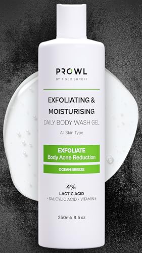 PROWL by Tiger Shroff Shower Gel Bodywash for Men 250ml|4% ( Salicylic Acid, Lactic Acid, Vit E) for Body Acne | All Skin Type Exfoliating Brightening & Moisturising Daily Body Wash for Tan Removal | Ocean Breeze is available on Amazon.