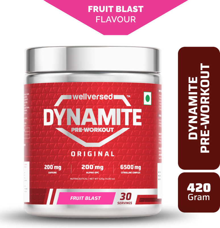 Wellversed Dynamite Pre-Workout (420g, 30 Servings) | Unleash Explosive Energy Pre Workout(420 g, Fruit Blast) is available on flipkart.