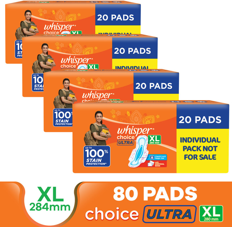 Whisper CHOICE ULTRA XL, UPTO 100% STAIN PROTECTION ALL DAY Sanitary Pad(Pack of 80) is available on flipkart.