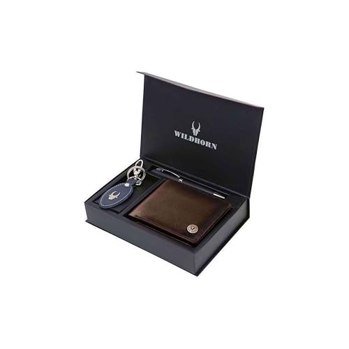 WildHorn Leather Wallet, Keychain & Pen Combo I Gift Hamper for Men (Brown Crunch) is available on Amazon.
